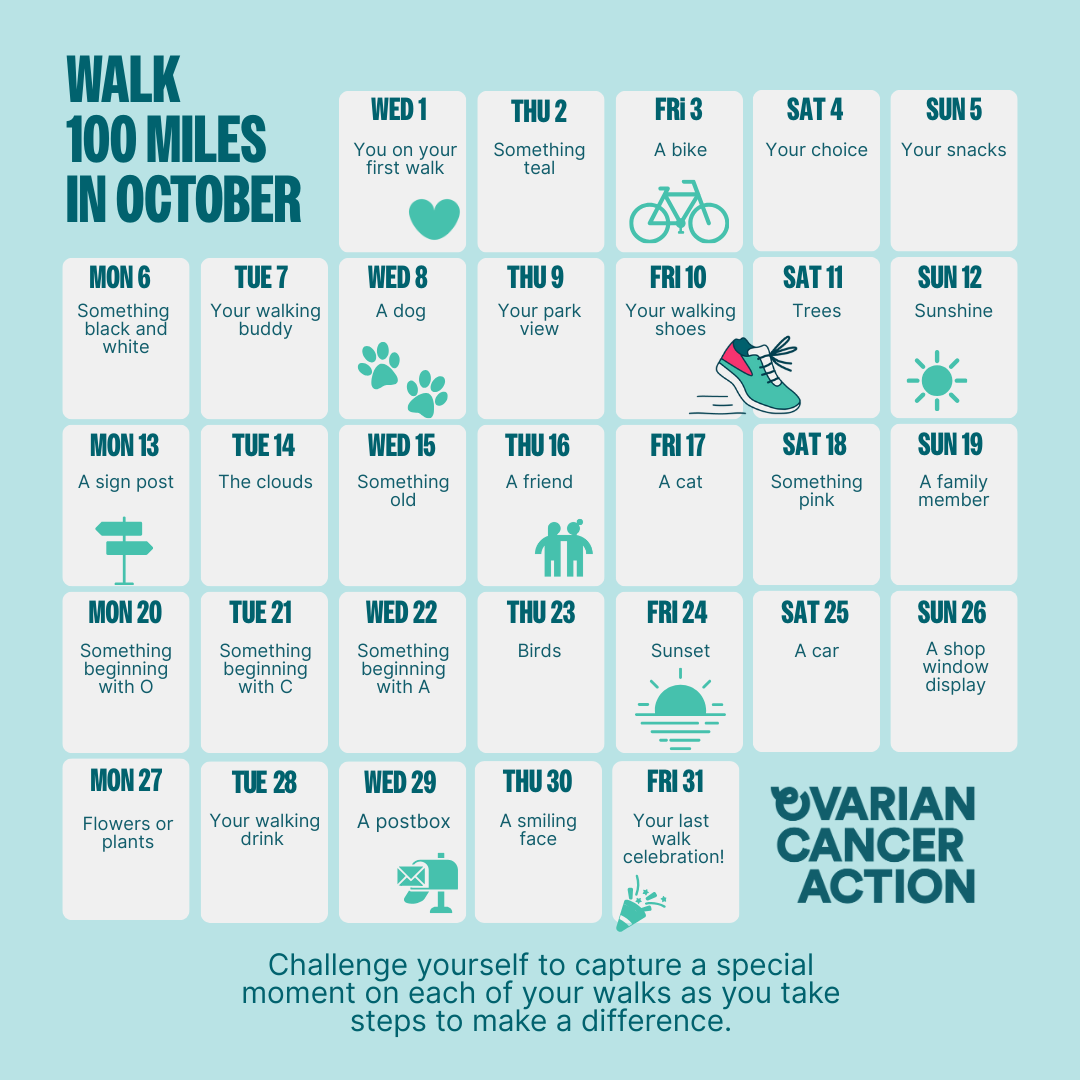 If you need any other support, we're always an email away. Reach out any time via fundraising@ovarian.org.uk or simply post in the Walk 100 Miles in October Facebook Group and we'll get back to you as soon as possible.